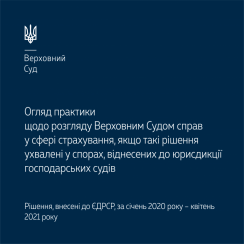 Пропонуємо до вашої уваги огляд практики щодо розгляду Верховним Судом справ у сфері страхування, якщо такі рішення ухвалені у спорах, віднесених до юрисдикції господарських судів (січень 2020 – квітень 2021 року).