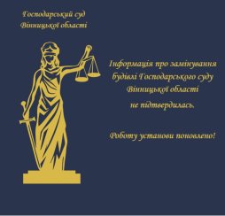Інформуємо, що Господарський суд Вінницької області відновив свою роботу після отримання повідомлення про мінування будівлі суду.