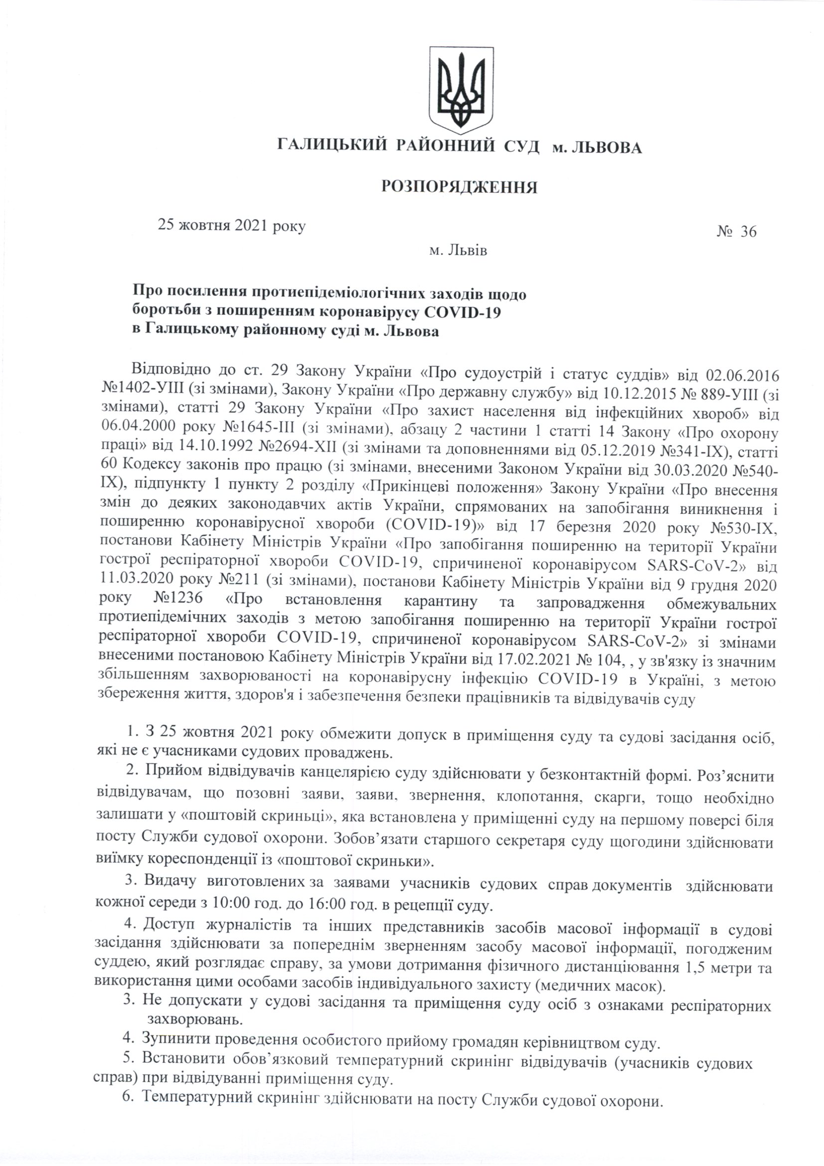 Галицький районний суд м. Львова повідомляє, що з метою попередження розповсюдження коронавірусної інфекції (COVID-19) серед працівників і відвідувачів суду в період різкого зростання у Львівській області кількості захворювань на гостру респіраторну хворобу COVID-19, спричинену коронавірусом SARS-CoV-2, з 25 жовтня 2021 року до Галицького районного суду допускаються тільки учасники судового процесу за умови пред’явлення судового виклику на поточну дату.
