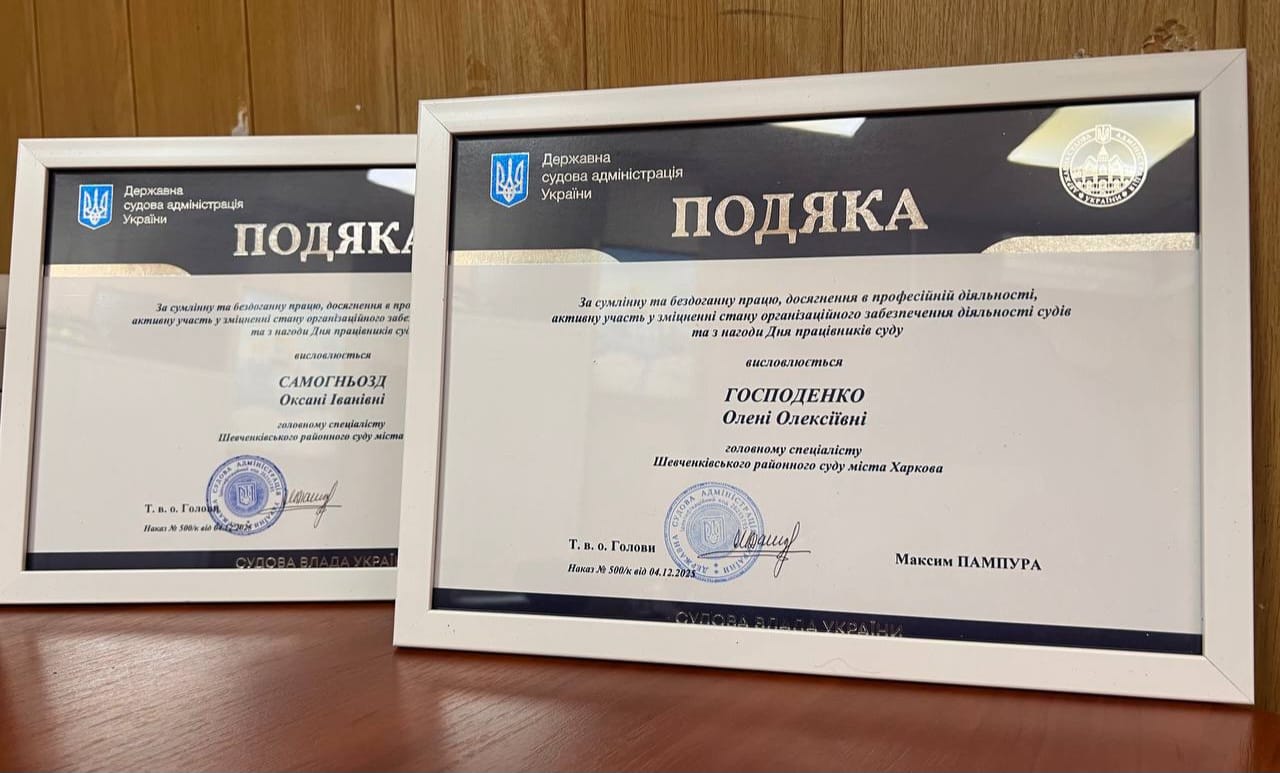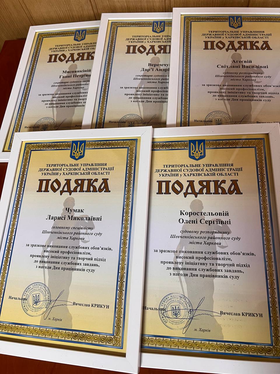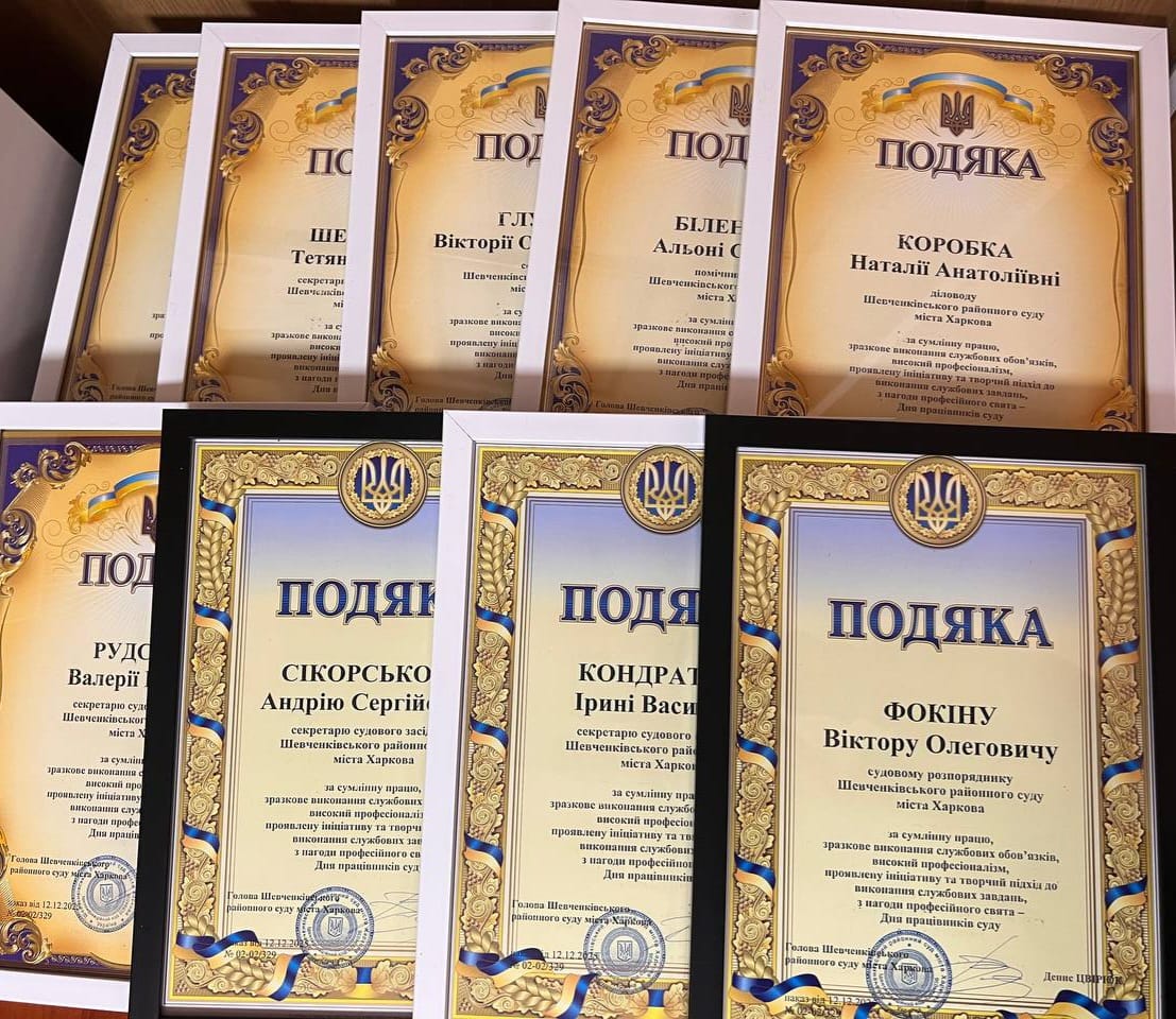 За сумлінну працю, зразкове виконання службових обов’язків, високий професіоналізм, проявлену ініціативу та творчий підхід до виконання службових завдань, з нагоди професійного свята - Дня працівників суду, відзначено Подякою голови Шевченківського районного суду міста Харкова: