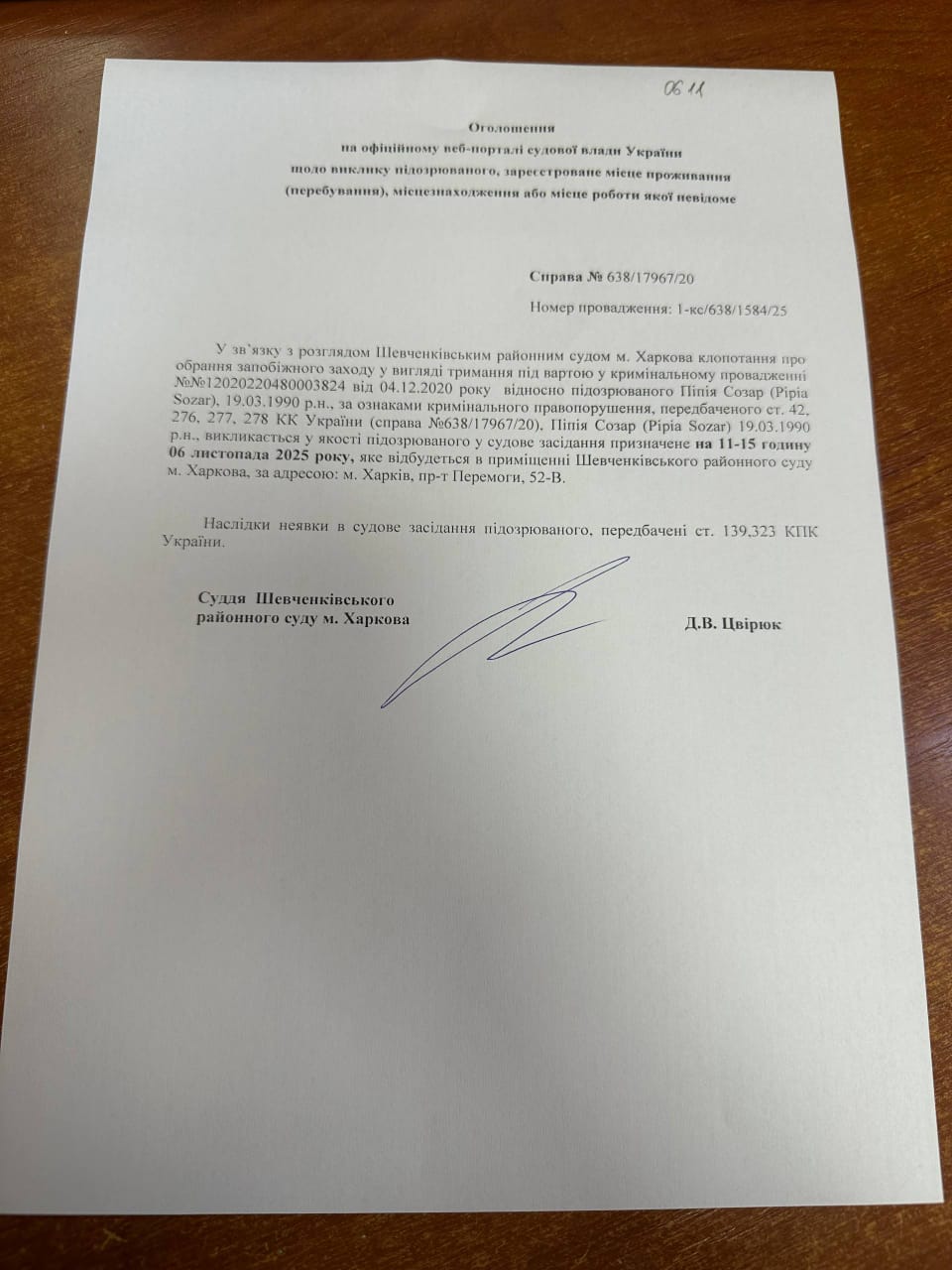 Оголошення про виклик Піпія Созар