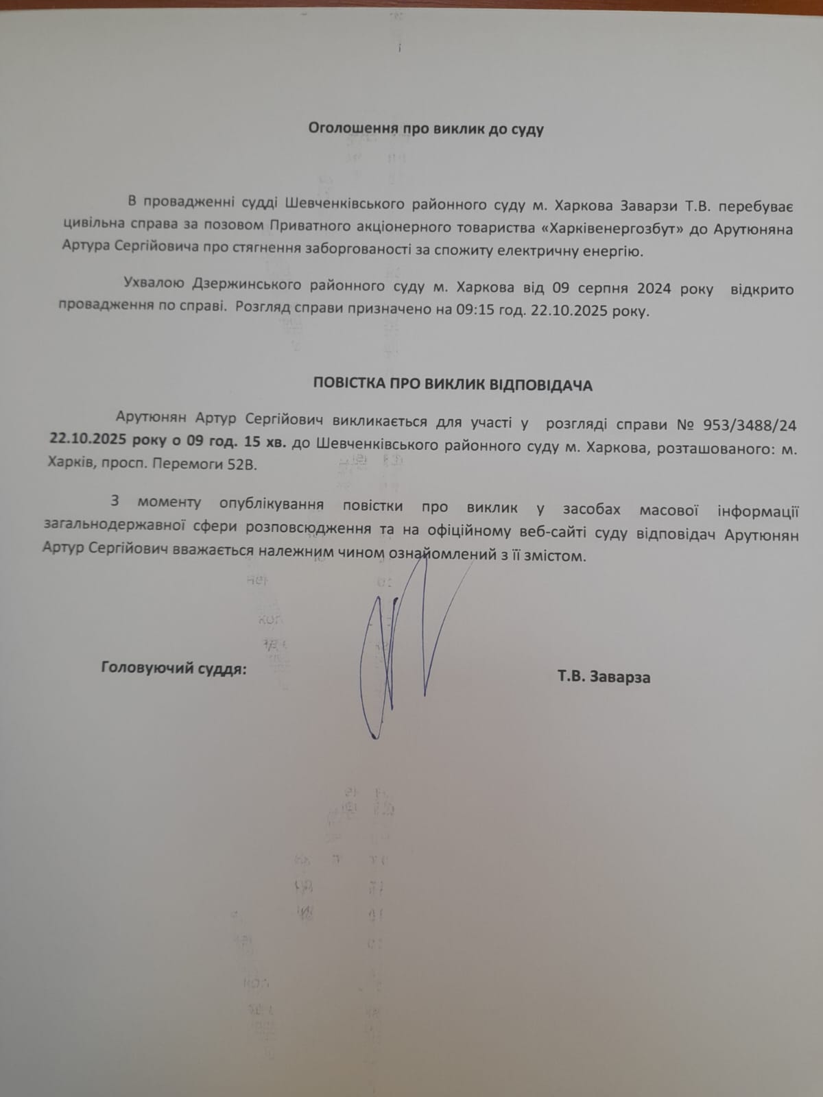 Оголошення про виклик Арутюнян А.С.
