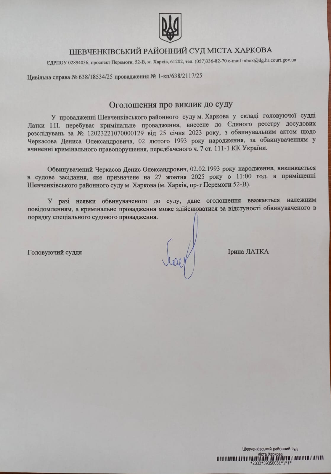 Увага, суд перейменовано з Дзержинський районний суд м. Харкова