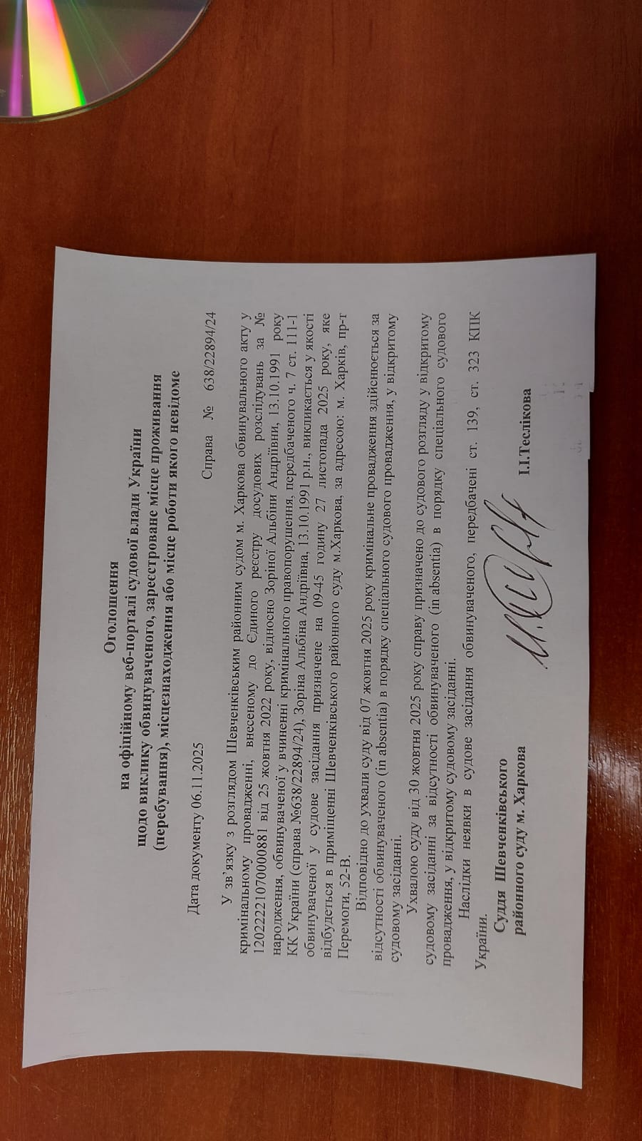 Оголошення про виклик особи в суд та повідомлення про судове рішення