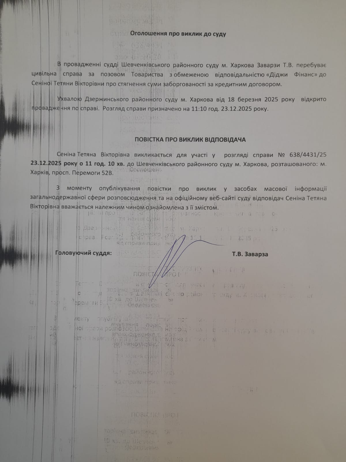 Оголошення про виклик особи в суд та повідомлення про судове рішення