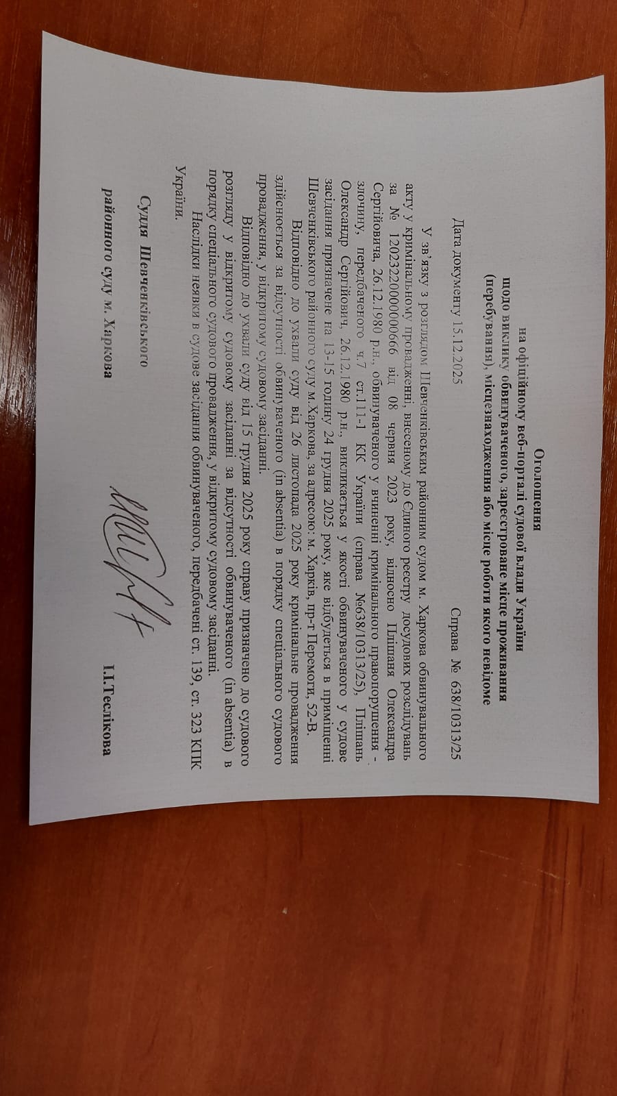 Оголошення про виклик особи в суд та повідомлення про судове рішення