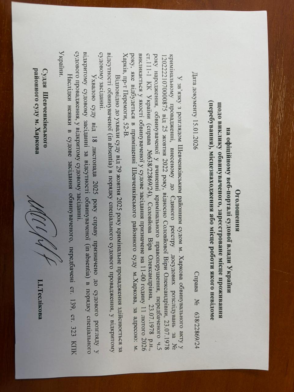 Оголошення про виклик особи в суд та повідомлення про судове рішення