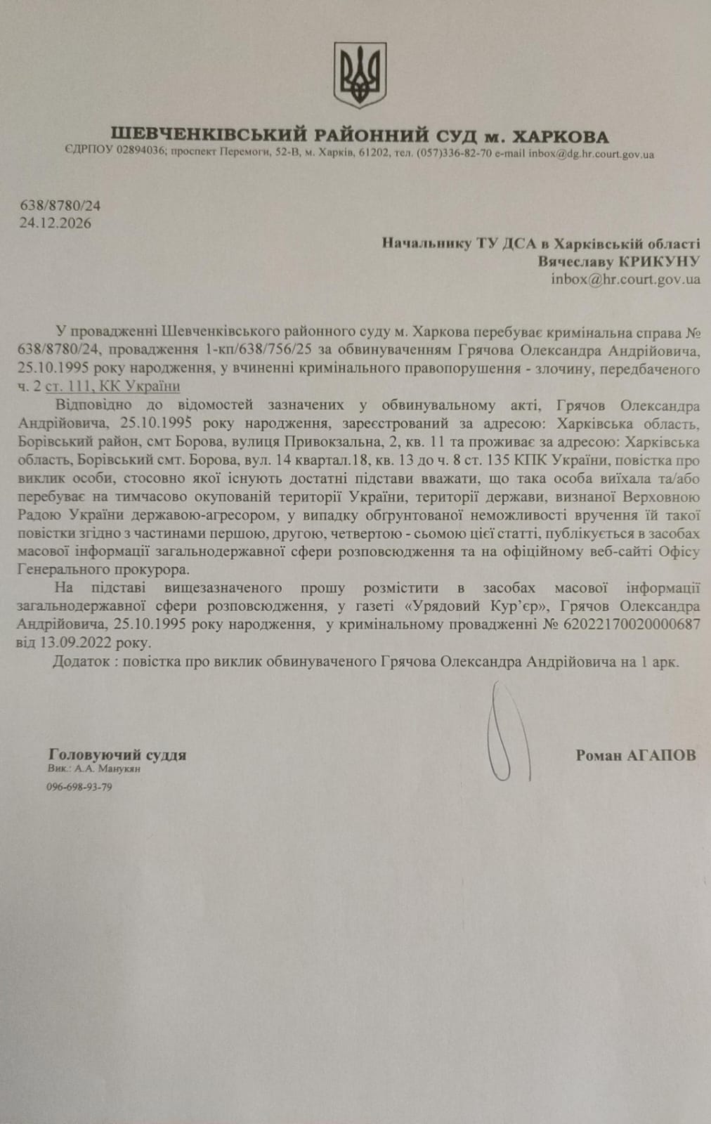 Викликається Грячов О.А.
