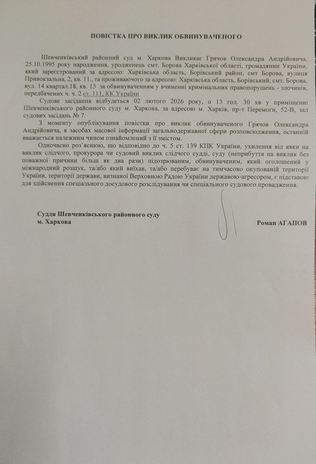 Оголошення про виклик особи в суд та повідомлення про судове рішення