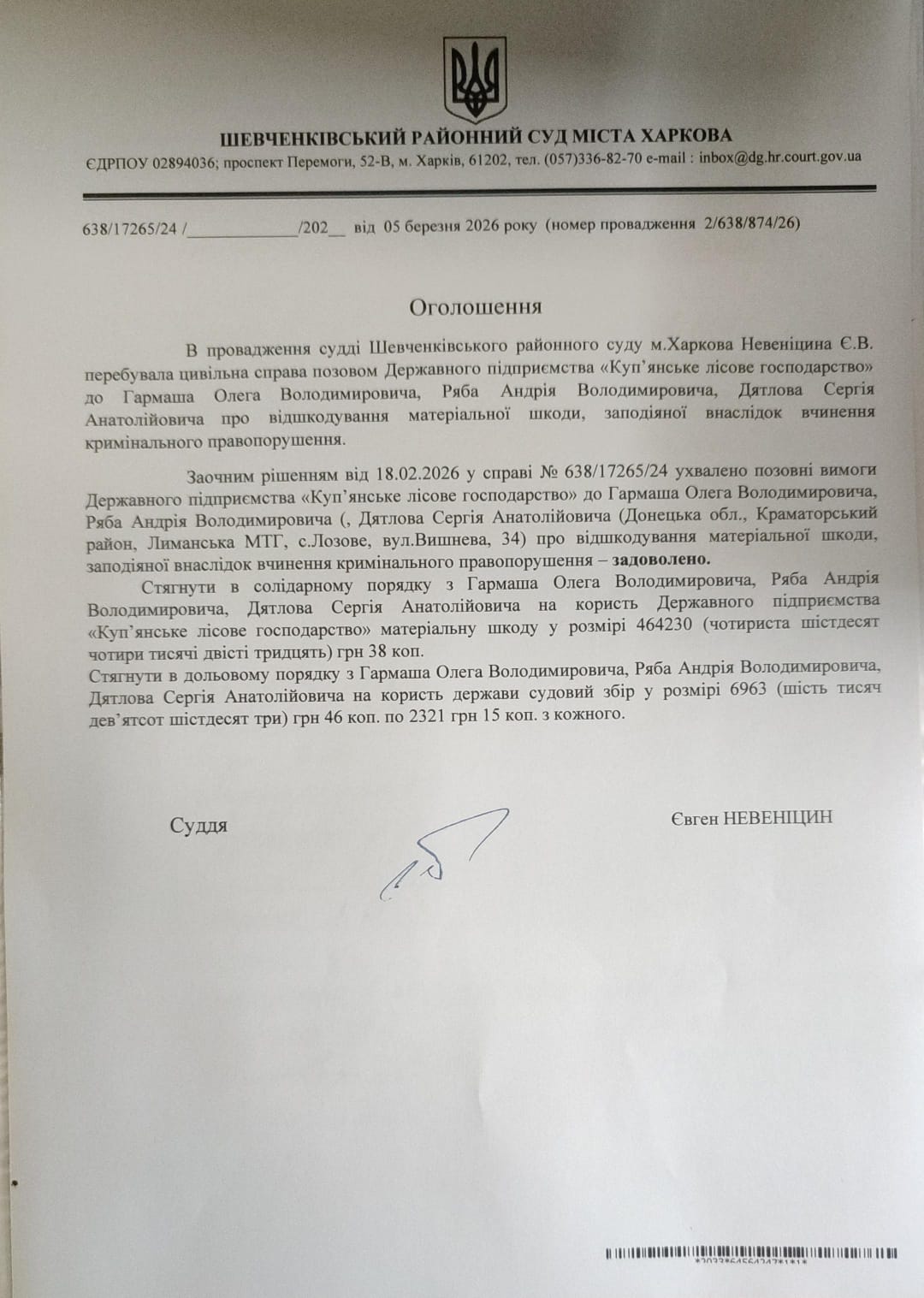 Оголошення про стягнення з Гармаша О.В., Ряба А. В., Дятлова С. А.